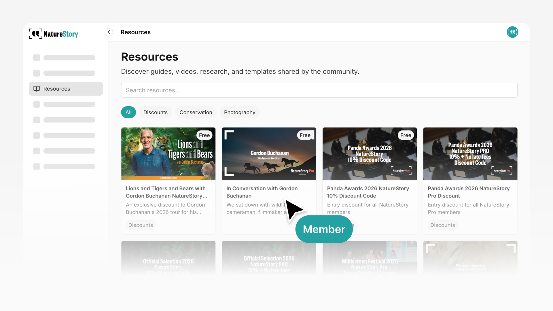 Your community members see the Resources page in their Community App. Clean thumbnail grid showing what's available to them. Clear titles explaining what each resource contains. Categories organizing related content together.